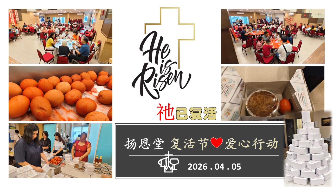 3. 复活节爱心行动:感谢主的恩典!在刚过去的复活节清晨,弟兄姊妹同心合意地预备了 250 份丰盛的餐点(包括香糯米鸡、滋润桃胶糖水及红鸡蛋),让大家在欢庆主复活的时刻一同享用。除了主内弟兄姐妹分享,感谢主差遣我们,成功将其中 100 份爱心餐点送至未信主的村民、亲戚及朋友手中。愿这份小小的礼物能温暖邻舍的心,不仅见证主耶稣基督复活的喜乐,更求主亲自动工,借此建立美好的生命连接,引领更多人认识救恩。