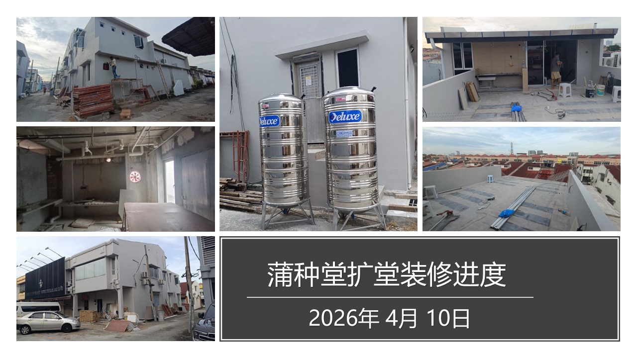 10. 蒲种堂扩堂工程进度: 感谢上帝的恩典,蒲种堂扩堂装修之结构工程(含地砖、油漆、石膏等)现已步入最后阶段。接下来将按计划进行机电与软装工程,包括安装冷气机、照明系统及各类家私。扩堂空间预计将于 6月 投入使用。请弟兄姐妹持续为工程的平安、施工的进度以及经费的筹措同心祷告,愿主亲自带领,使一切圣工顺利完成。。