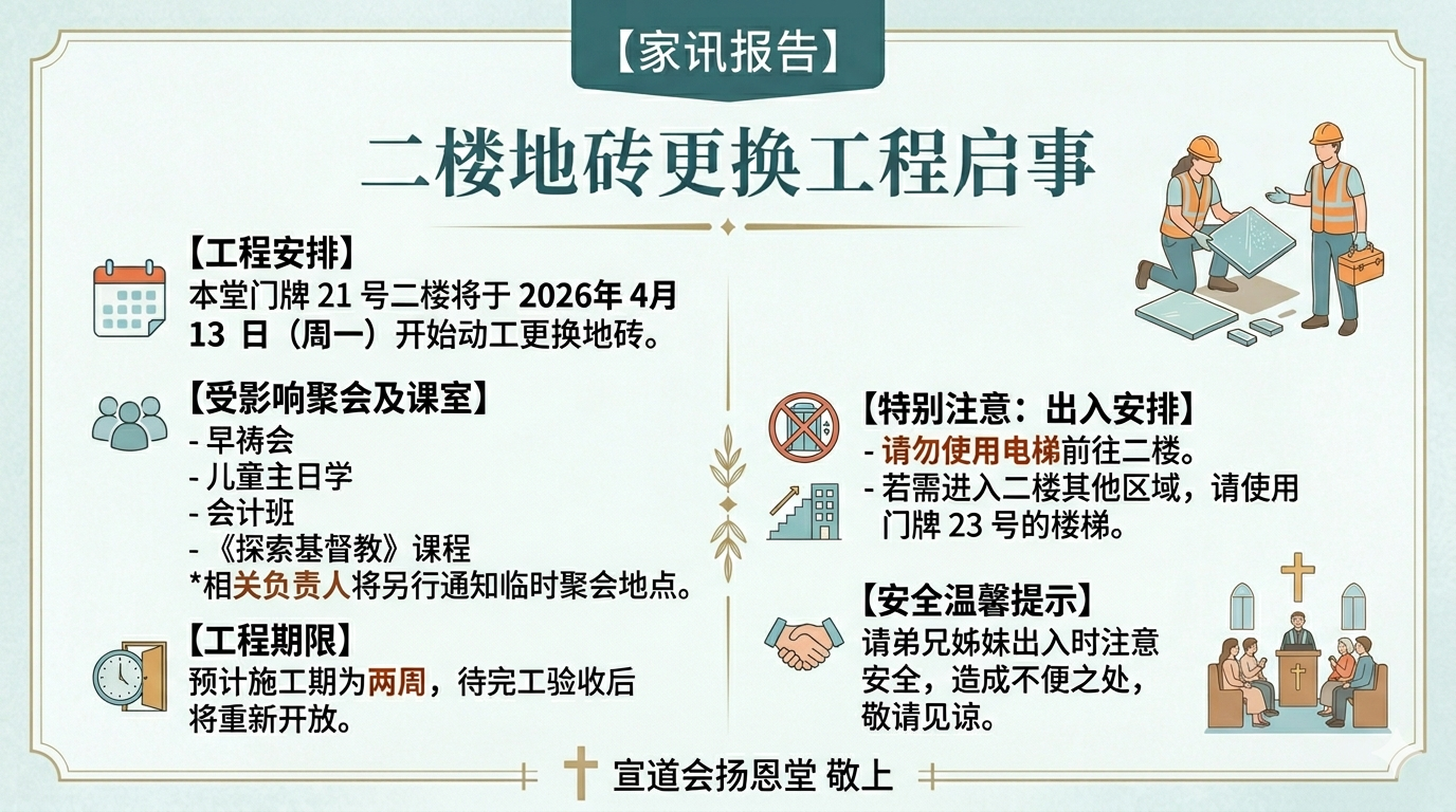 8. 二楼地砖更换工程:本堂门牌 21 号二楼将于 2026年4月13日(周一)开始动工更换地砖。施工期间,场地将影响课室使用者,包括:早祷会、儿童主日学、会计班及《探索基督教》课程,相关负责人将另行通知临时聚会地点。施工期间请勿使用电梯前往二楼。若需进入二楼其他区域,请使用门牌 23 号的楼梯。预计施工期为两周,待完工验收后将重新开放。请弟兄姊妹出入时注意安全,造成不便之处,敬请见谅。