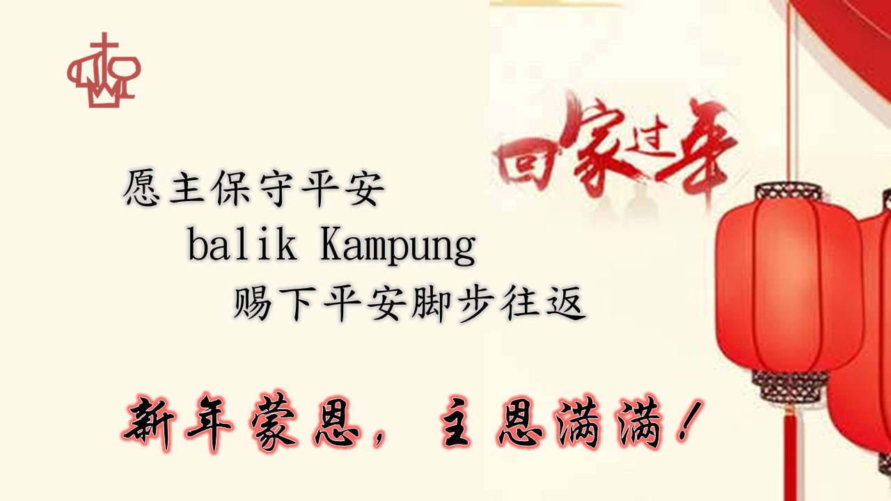- 回家过年:愿主保守大家平安 balik kampung,路途蒙主看顾,小心驾驶,平安往返,在新年团聚中为主作美好见证,新年蒙恩,主恩满满!