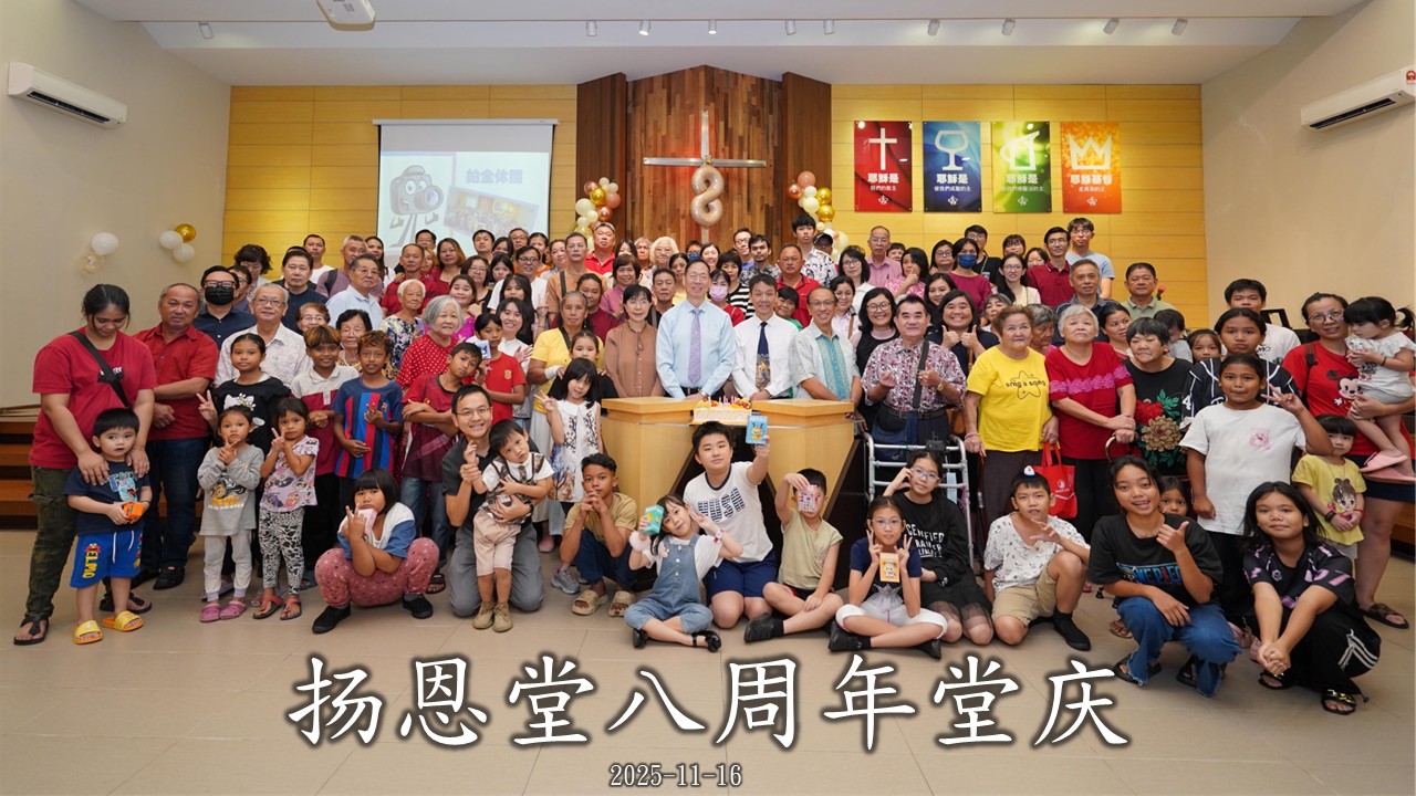 3. 八周年堂庆:扬恩堂已于2025年11月16日举行成立八周年堂庆主日崇拜。感谢主带领,聚会在平安喜乐中圆满结束,亦感谢弟兄姐妹的代祷与参与和服事。当日由简耀堂牧师证道,David 陈世久牧师祝福祷告;并有切蛋糕、拍全体照 、聚餐、儿童表演,以及原住民、印尼与缅甸弟兄姐妹献唱诗歌,同心数算主恩。衷心感谢主八年来对扬恩堂的看顾与带领,使教会在 士毛月与武来岸新村 继续为主作见证,服事社区,愿一切荣耀归于主。