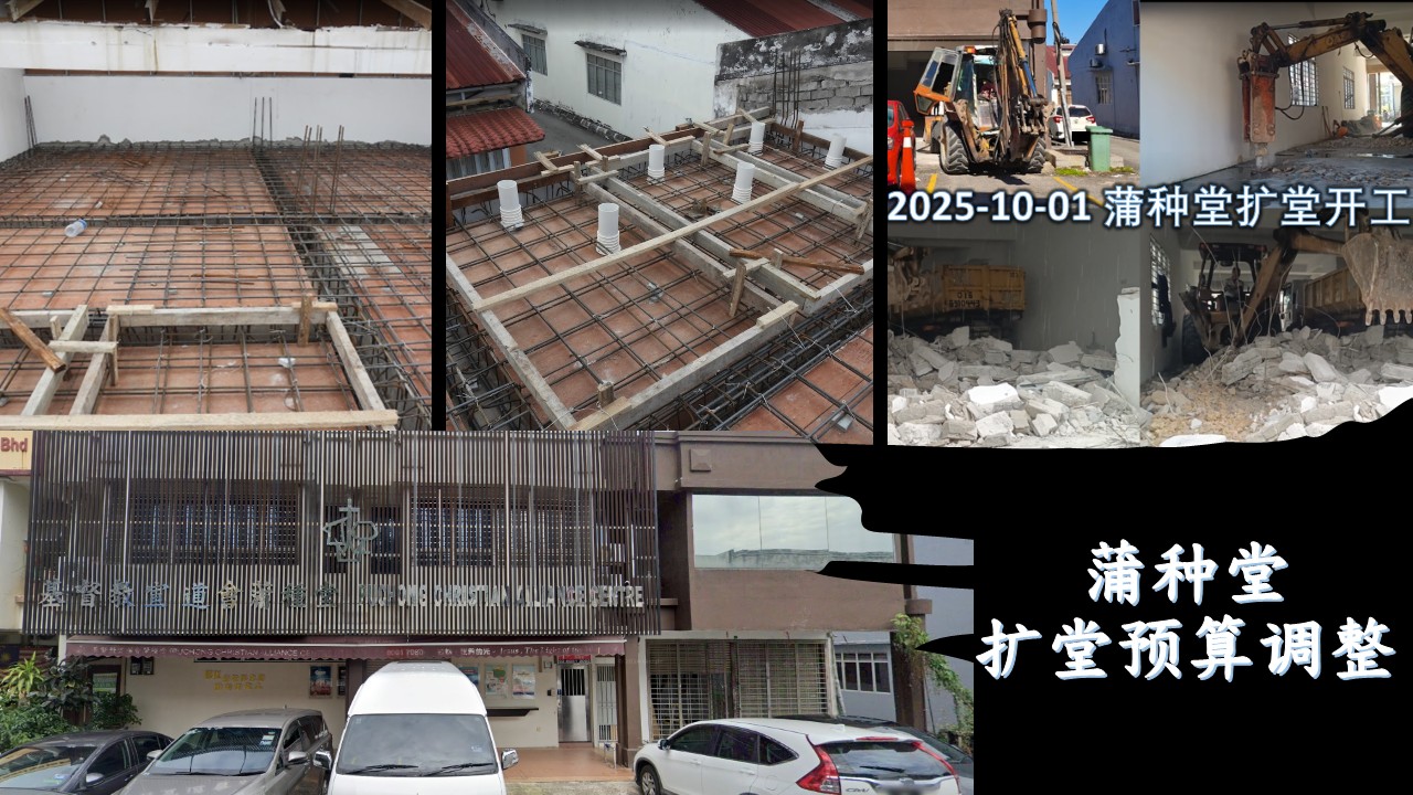 5. 蒲种堂扩堂预算调整:感谢主的带领,蒲种堂扩堂工程在过去一个半月里整体进展顺利,虽然过程中有一些小拦阻。因向有关当局申请与审批延误开工时间,加上图则与设计上的必要调整,扩堂总预算需从原定的 RM1,855,000.00 调整为 RM2,265,000.00。“扩堂基金”的筹款进展与余额,请参考随附统计表。也请弟兄姐妹继续为扩堂工程与经费代祷,求主供应一切所需,保守工程平安顺利、按时完工,成为荣耀主、造就弟兄姐妹与社区的圣工。