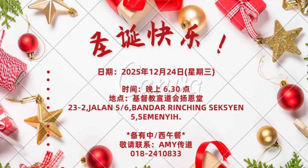 - 圣诞晚会:✨一年一度的圣诞节即将来临!本堂将于 12 月 24 日(星期三)晚上 6:30 举办圣诞晚会。诚邀弟兄姐妹预备心参与,并从现在开始关心、邀请未信主的亲友,为他们祷告,求神预备他们的心来聆听福音、经历主的爱。晚会备有中餐和西餐,来宾需事先选餐,以方便预备餐位。让我们一同期待一个充满喜乐与祝福的圣诞夜!🎄
