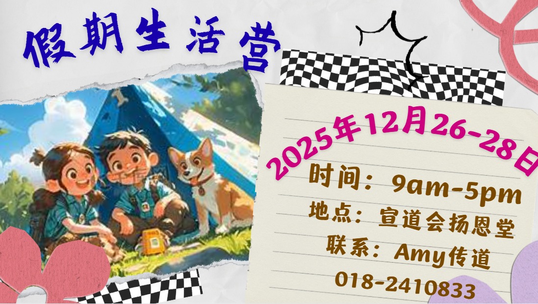 - 假期生活营:2025年12 月 26-28日本堂将举办儿少营。欢迎各位儿童和少年人们,一起来参加年尾的三天两夜,从满欢乐和祝福的假期生活营。详情和报名请联系AMY传道。